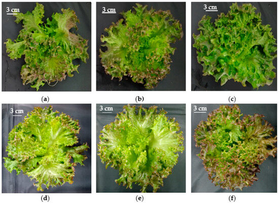 Purple ‘Soltero’ lettuce grown hydroponically in a vertical farm exposed to (a) BW-90 µmol m−2 s−1; (b) RW-90 µmol m−2 s−1; (c) RB-90 µmol m−2 s−1; (d) BW-180 µmol m−2 s−1; (e) RW-180 µmol m−2 s−1; (f) RB-180 µmol m−2 s−1 at 45 days post-transplanting.