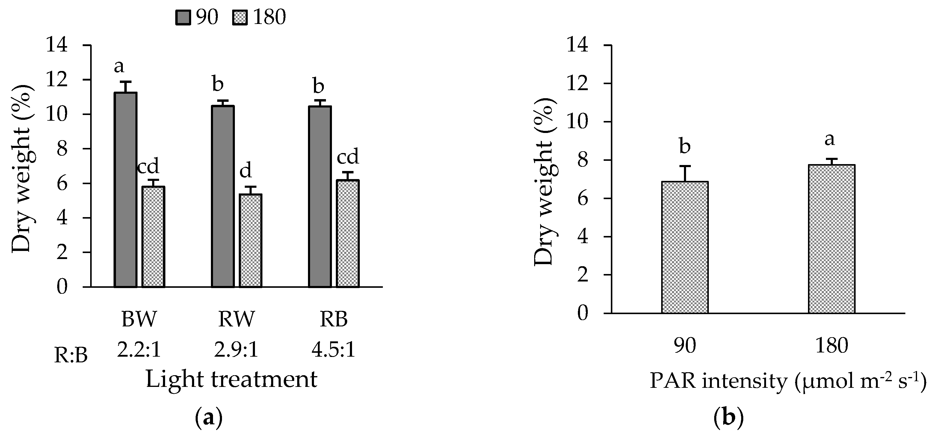 In green ‘Bartimer’ lettuce, a significant interaction between light intensity and spectrum on DWP was observed (Figure 2a). Treatments BW, RW, and RB-90 µmol m−2 s−1 showed the highest values; in particular, BW-90 µmol m−2 s−1 showed the highest value of 11.2%. Thus, the lower PAR intensity improved the DWP by 95.3, 93.8 and 69.1% under RW, BW and RB, respectively (Figure 2a). In purple ‘Soltero’ lettuce, significant differences were observed in the intensity factor only, with 180 µmol m−2 s−1 being the highest value (7.8%) compared to 90 µmol m−2 s−1 (6.9%) which meant a 13.0% increase in DWP (Figure 2b).