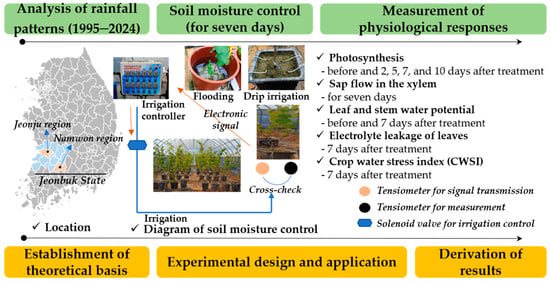 The experimental materials comprised three-year-old grapevines of the cultivars ‘Campbell Early’ and ‘Jinok’ (cutting-propagated), grown in 40 L−1 plastic containers. Grapevines were planted in plastic containers filled with sandy loam soil, comprising 36.5% sand, 26.3% silt, and 37.2% clay. The experiments were carried out within a plastic greenhouse located at the experimental field (an elevation of 32 m asl, 35°51′02″ N, 127°07′51″ E) of Jeonbuk National University. The grapevines were vertically trained with three to four shoots per vine, taking into account the root zone volume. After retaining 12 leaves per shoot, the apical tips were excised. The grape clusters were managed to maintain an average of 1.5 clusters per shoot, with the number of berries per cluster adjusted to 70–80. Fertilization, pruning, and pest and disease management of the grapevines were carried out in accordance with established conventional practices. The schematic diagram of the experiment, designed to establish the theoretical framework of the study and validate the effects of soil moisture treatment, is shown in Figure 1.