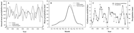 Changes in precipitation characteristics documented in Jeonju and Namwon regions of South Korea over the past 30 years (1995–2024). (A): distribution of annual average precipitation; (B): average monthly precipitation; (C): number of consecutive rainy days and total rainfall during the rainy season (June to August) in the Namwon regions.