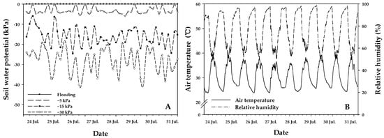 Distribution of soil water potential (A) through irrigation control and changes in air temperature and relative humidity (B) during the experimental period.