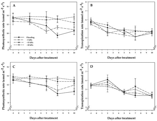Changes in photosynthetic rate (A,C) and transpiration rate (B,D) of table grapevine cultivar ‘Campbell Early’ (A,B) and ‘Jinok’ (C,D) under excessive soil moisture. Vertical bars denote the standard error of the means (n = 6).