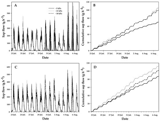 Changes in daily (A,C) and cumulative sap flow (B,D) in the xylem of table grapevine cultivars ‘Campbell Early’ (A,B) and ‘Jinok’ (C,D) under excessive soil moisture.