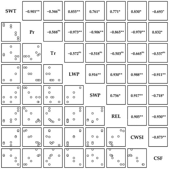 Scatter plot matrix and Pearson’s coefficients of grapevine cultivars ‘Campbell Early’ and ‘Jinok’ physiological parameter under excessive soil water moisture. Soil water potential (SWT), Pr (photosynthetic rate), Tr (transpiration rate), LWP (leaf water potential), SWP (stem water potential), REL (relative electrolyte leakage of leaves), CWSI (crop water stress index), and CSF (cumulative sap flow in the xylem). ns, *, and ** correspondingly indicate not significant or significant differences at p < 0.05 and p < 0.01, respectively (n = 8).
