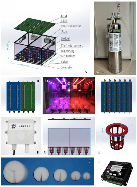 The components of the experimental apparatus used for the acclimatization of coconut seedlings. (A) One of the four acclimatization chambers used to study the growth of embryo-cultured coconut seedlings. (B) An aerial view of how the chamber was subdivided into two sub-chambers, each with three nutrient channels, and the positioning of the LED light strips. (C) The CO2 supply system, with a valve controlling gas flow. (D) The customized lighting system in operation. (E) The planform of the main body where seedlings from embryo culture could be placed. (F) The transmitters for CO2 and air humidity monitoring purposes. (G) The liquid medium supply and plant supporting system. (H) The customized plastic basket for seedling support. (I) The environmental control computer for data monitoring and recording purposes. (J) The customized sponge cylinder (to support the seedlings in the baskets).