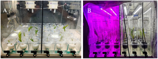 Unless otherwise stated, 5-month-old seedlings were removed from their embryo culture vessels, and in a LAF hood, their roots were washed with sterile water to eliminate any adhering medium components. Seedlings of uniform size and good health were individually placed into foam cylinders moistened with a liquid medium and then into the baskets. The baskets were then transferred to the previously surface-sterilized acclimatization chamber. The inner surfaces of the acclimatization chambers were cleaned by first washing with tap water, followed by a strong detergent, and then sterile water. Once dry, the surfaces of the chamber were wiped twice with adhesive-bonded fabric wipes containing 70% (v/v) alcohol. All other components were washed with sodium hypochlorite 2.1% (v/v) for 7 min, followed by a single rinse with sterile water. After cleaning, the chambers and components were moved from the LAF hood to a culture room, recleaned with 70% ethanol, and exposed to UV light overnight to complete the sterilization process.