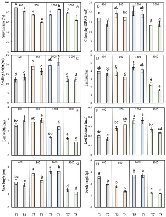 The influence of atmospheric carbon dioxide concentration (400, 800, 1600, or 3000 μmol mol−1) and light intensity at 300 (odd treatment numbers) and 600 μmol m2 s−1 (even treatment numbers) on the growth and development of 5-month-old MYD in vitro-grown seedlings. (A) Percentage seedling survival rate. (B) Leaf chlorophyl content as assessed by SPAD. (C) Seedling height. (D) Leaf number. (E) Leaf width. (F) Leaf thickness. (G) Root length. (H) Seedling fresh weight. Each dataset includes three replications of six seedlings in each treatment, and bars represent the mean with two standard errors. The letter above the bars indicates a significant difference within that dataset. Treatments marked with the same letter are not significantly different from each other, while treatments marked with different letters are significantly different (p < 0.05). T1 to T8 represented Treatment 1 to Treatment 8, as mentioned in Table 1.