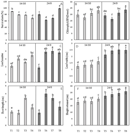 The influence of photoperiod (either 14/10 h day/night or 24/0 constant light) and light quality [either pure white light (1 and 5) or red and blue light applied at three different ratios of 3:7 (2 and 6), 1:1 (3 and 7), and 7:3 (4 and 8)] on the growth and development of 5-month-old MYD in vitro-grown seedlings. (A) Percentage seedling survival rate. (B) Leaf chlorophyl content as assessed by SPAD. (C) Leaf number. (D) Leaf width. (E) Root length. (F) Seedling height. Each dataset includes three replications of six seedlings, and the bars represent the mean with two standard errors. The letter above the bars indicates a significant difference within that dataset. Treatments marked with the same letter are not significantly different from each other, while treatments marked with different letters are significantly different (p < 0.05). T1 to T8 represented Treatment 1 to Treatment 8, as mentioned in Table 2.
