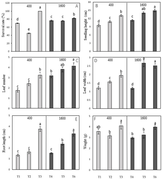 The influence of atmospheric CO2 concentration (at 400 and 1600 μmol mol−1) when applied to seedlings of different ages [either 4 months old (1 and 4), 6 months old (2 and 5), or 7 to 9 months of age (3 and 6), all applied at the previously determined best light intensity (600 μmol m−2 s−1) and light quality (red/blue ratio 7:3) on the growth and development of MYD in vitro-grown seedlings. (A) Percentage seedling survival rate. (B) Seedling height attainment. (C) Leaf number. (D) Leaf width. (E) Root length. (F) Fresh weight. Each dataset includes three replications of six seedlings, and the bars represent the mean with two standard errors. The letter above the bars indicates a significant difference within that dataset. Treatments marked with the same letter are not significantly different from each other, while treatments marked with different letters are significantly different (p < 0.05). T1 to T6 represented Treatment 1 to Treatment 6, as mentioned in Table 3.