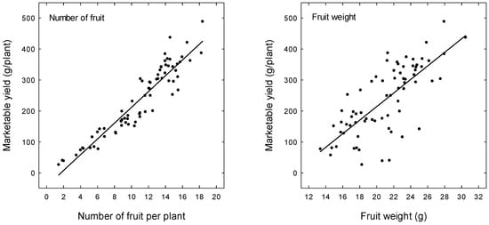 Yield is dependent on both the number of fruit per plant and the size of the fruit. In the present experiments, there were linear relationships between yield and the number of fruit per plant and fruit weight (Figure 1). Yield was more strongly related to the number of fruits per plant (p < 0.001; R2 = 0.88) than to fruit weight (p < 0.001; R2 = 0.54) across the six cultivars and two years (Figure 1).