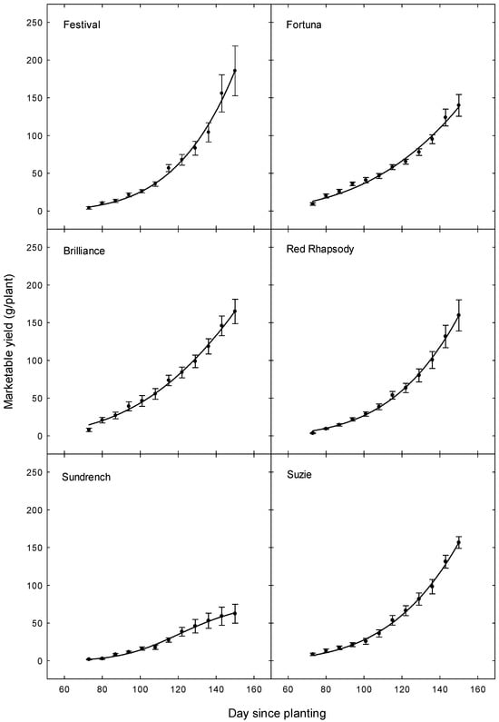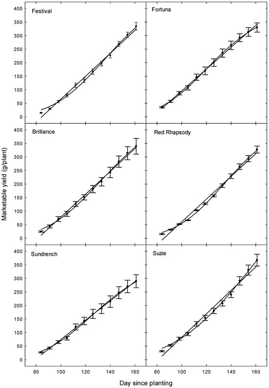 Seasonal changes in cumulative marketable yield in six strawberry cultivars in Queensland in 2023. Data are the means of six replicates per cultivar with standard errors (s.e.). The changes in yield followed linear or dose-logistic regressions, which are both presented (p < 0.001, R2s = 0.98 to 0.99, n = 12).
