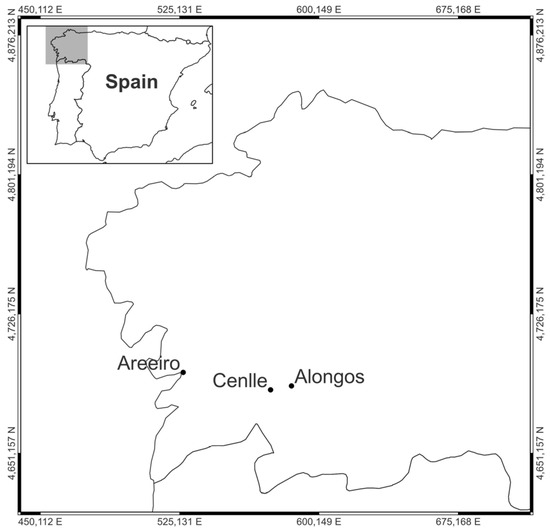 The study was conducted in three vineyards in northwestern Spain: Areeiro (42°24′13″ N, 8°40′18″ W), Alongos (42°20′03″ N, 7°57′48″ W), and Cenlle (42°18′56″ N, 8°06′03″ W) (Figure 1). This region is strongly influenced by maritime conditions, which diminish as one heads inland toward the east and the distance from the coast increases [28].