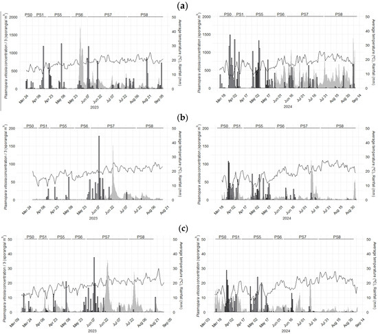 Phenology (upper lines: PS 0—bud development, PS 1—leaf development, PS 5—inflorescence emergence, PS 6—flowering, PS 7—development of fruit, and PS 8—ripening of berries), Plasmopara viticola daily concentrations (gray area), average temperature (lines), and rainfall (bars) during the years of study. In order to facilitate the comprehension of the graphics, Plasmopara viticola sporangium concentrations were divided by three in the 2023 graphs. (a) Areeiro 2023–2024, (b) Alongos 2023–2024, and (c) Cenlle 2023–2024.