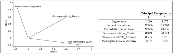 To determine the relationship between the concentrations of P. viticola sporangia recorded in the three vineyards, a principal component analysis was conducted. Principal component 1 (PC1) and principal component 2 (PC2) accounted for approximately 74% of the variance in the data. PC1 grouped the sporangium concentrations from the Alongos and Cenlle vineyards, while those from Areeiro were placed in PC2 (Figure 3).