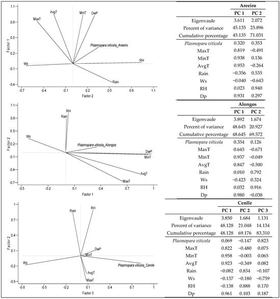 In order to identify the meteorological factors that most influence the variation in P. viticola sporangium concentrations across the different vineyards, three additional PCAs were performed, one for each study area. The PCA for Cenlle grouped the data into three principal components, while the PCA for Areeiro and Alongos grouped the data into two components. In both Areeiro and Alongos, the two components accounted for a similar percentage of the data variance, close to 70%. In contrast, the three components from the Cenlle PCA accounted for 83.3% of the data variance (Figure 4).