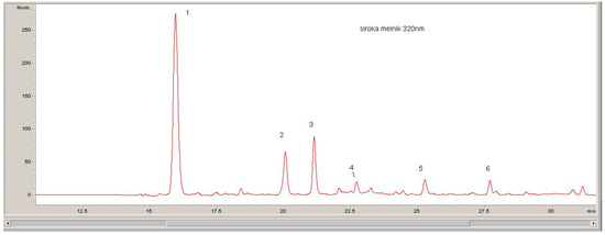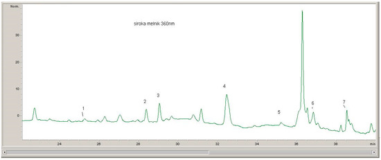 The quantitative evaluation of the phenolic compounds in Serbian and Bulgarian red wines was based on the peak areas in the HPLC-DAD chromatograms, which were recorded at 520 nm (for anthocyanins), 360 nm (for flavonols), and 320 nm (for hydroxycinnamic acids) (Figure 1, Figure 2 and Figure 3).