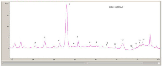 1, Delphinidin-3-O-glucoside; 2, Cyanidin-3-O-glucoside; 3, Petunidin-3-O-glucoside; 4, Peonidin-3-O-glucoside; 5, Malvidin-3-O-glucoside; 6, Delphinidin-3-O-acetylglucoside; 7, Vitisin A; 8, Cyanidin-3-O-acetylglucoside; 9, Petunidin-3-O-acetylglucoside; 10, Delphinidin-3-O-p-coumaroylglucoside; 11, Peonidin-3-O-acetylglucoside; 12, Malvidin-3-O-acetylglucoside; 13, Cyanidin-3-O-p-coumaroylglucoside; 14, Petunidin-3-O-p-coumaroylglucoside; 15, Peonidin-3-O-p-coumaroylglucoside; 16, Malvidin-3-O-p-coumaroylglucoside.