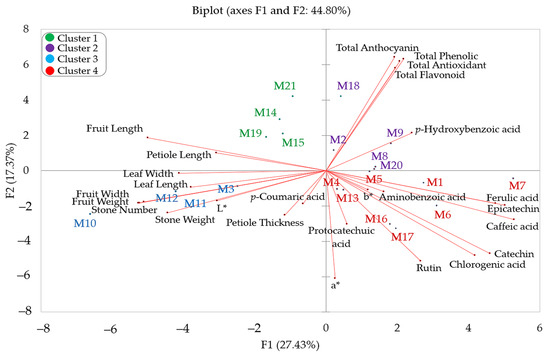 The biplot graph shows the outcomes of a PCA that shows how the morphological and biochemical traits of different hawthorn genotypes are related to each other (Figure 1). It also shows how these traits affect the distribution of genotypes. The first two principal components (F1 and F2) explained 44.80% of the total variance, with F1 contributing 27.43% and F2 contributing 17.37%. Fruit weight, fruit width, fruit length, stone weight, stone number, leaf width, leaf length, petiole length, caffeic acid, ferulic acid, catechin, epicatechin, and chlorogenic acid contributed the most to F1. Total phenolic, a*, total anthocyanins, total antioxidants, total flavonoids, and rutin contributed the most to F2. M3, M10, M11, and M12 genotypes were grouped in relation to fruit weight, fruit width, stone wieght, stone number, leaf width, and leaf length variables. Similar clustering is seen in the heatmap graph (Figure 2). While M14, M15, M19, and M21 genotypes were determined to be related to fruit length and petiole length variables in the PCA graph, it was determined that they were in the same cluster in the heatmap graph. M2, M8, M9, M18, and M 20 genotypes were determined to be related to total anthocyanins, total phenolics, total flavonoids, total antioxidants, and p-Hydroxybenzoic acid, while M1, M4, M5, M6, M7, M13, M16 and M17 genotypes were determined to be related to ferulic acid, aminobenzoic acid, epicatechin, caffeic acid, chlorogenic acid, rutin, protocatechuic acid, a*, b* and catechin. Additionally, these genotypes are grouped within the same cluster in the heatmap graph (Figure 2).