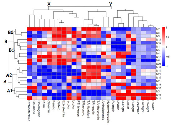 Heatmap hierarchical clustering analysis is one of the most common multivariate statistical methods that allows the genotypes and the examined traits in the studies to be evaluated together. Heatmap hierarchical clustering analysis has been widely used in many fruit species such as hawthorn [83], grape [80], strawberry [43], and oleaster [79] to cluster genotypes or varieties according to their traits. Heatmap hierarchical clustering analysis was performed to classify the examined hawthorn genotypes according to their morphological and biochemical traits (Figure 2). In the heatmap hierarchical clustering analysis, the color intensity changing from blue to red indicates the height in the values of the traits of the genotypes. Accordingly, as a result of the heatmap hierarchical clustering analysis, the genotypes were divided into two main groups. Each group was divided into two subgroups within itself. The genotypes M1, M4, M5, M6, M7, M8, M9, M13, M16, M17, and M20 constituted Group B, while the other genotypes constituted Group A. The genotypes in Group B1 (M7, M8, and M9) had high values in terms of biochemical contents and individual phenolics, while the genotypes in Group B2 (M1, M4, M5, M6, M13, M16, M17, and M20) had high values in terms of individual phenolic contents. The genotypes in Group A1 (M3, M10, M11, and M12) exhibited high values in terms of fruit and leaf characteristics, while the genotypes in Group A2 (M2, M14, M15, M18, M19, and M21) exhibited high values in terms of biochemical properties.