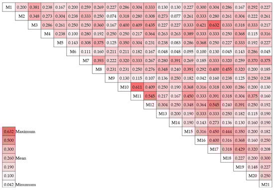 The Jaccard method was employed to evaluate the similarity among the 21 genotypes, which led to the production of similarity coefficient values for each genotype (Figure 3). The average dice similarity coefficient was determined to be 0.26. The Jaccard similarity coefficient was employed to analyze the genotypes, and it was determined that genotype M9 and genotype 16 had the lowest similarity, with a coefficient value of 0.04. Conversely, the coefficient value of 0.63 was used to determine that genotypes M17 and M3 were the most similar.