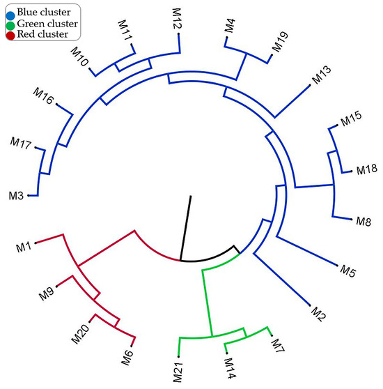To understand the differentiation levels and diversity of genotypes, the UPGMA dendrogram is presented in Figure 4. The blue group, which includes the genotypes M2, M3, M4, M5, M8, M10, M11, M12, M13, M15, M16, M17, M18, and M19, represents genotypes that are genetically close to each other. It can be understood that there is a significant similarity between these genotypes and that they probably come from the same genetic pool. The green group includes the genotypes M7, M14, and M21, and it was determined that they have a different genetic structure compared to the other groups. The red group includes the genotypes M1, M6, M9, and M20, and it was determined that these genotypes have a different genetic profile than the other groups. The separation of the colors represents the degree of genetic distance. While the blue genotypes are more genetically close to each other, the genotypes in the blue and green groups are genetically more different than the genotypes in the red group. The green and red groups have branched off from a common ancestor with the blue group. This may be a result of genetic differentiation. According to the dendrogram result, it can be used for preserving genetic diversity, planning breeding programs, and selecting genotypes with specific agronomic traits. More similar genotypes, such as the blue group, carry the same traits, while more distant genotypes, such as the green and red groups, can be considered potential candidates to increase genetic diversity.