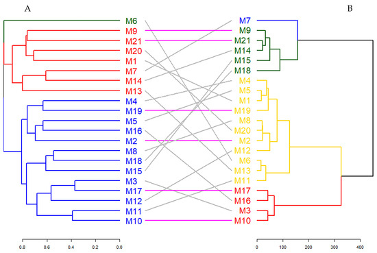 Comparison of dendrograms for ISSR markers (A) and morphological and biochemical data (B) with entanglement = 0.714.