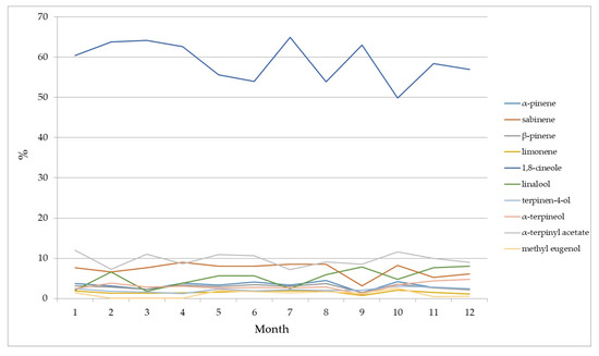 Perhaps the most interesting month is September, when the content of several compounds (α-pinene, sabinene, β-pinene, limonene, α-terpineol, α-terpinyl acetate, methyl eugenol) suddenly decreased sharply. On the other hand, the content of linalool and 1,8-cineole was increased. This indicates a possible environmental influence. After three months of high air temperatures, the average temperature in September was actually almost 5 degrees lower than in July and August. In addition, after two months with very little precipitation (5.1 mm in July and 3.5 mm in August), a larger amount of precipitation (43.1 mm) fell in September (Table 1). It is possible that this climatic factor also had an influence on the higher content of linalool and 1,8-cineole. Linalool is also interesting because of the significant differences between the months within the individual seasons. For example, the linalool content was relatively low in January (2.08%) and March (1.77%), while it was significantly higher in February (6.56%). A similar situation was observed a few months later, when the linalool content was higher in June (5.67%) and August (5.88%), while it was significantly lower in July (2.47%). The same variation was observed in the period between September and November (Table 2, Figure 2). A comparable study was presented by Di Leo Lira et al. [8], who analyzed EO from leaves collected in Argentina from February 2006 to May 2007. However, they did not take samples in every month of the one-year study period. The linalool content in Argentina varied between 9.7% (March 2006) and 15.9% (June 2006). Although there were seasonal variations, the linalool content was much more consistent [8].