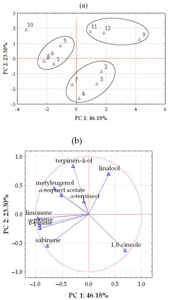 PCAs were carried out for the ten most abundant compounds. Principal component (PC) 1 and PC 2 explained 69.48% of the variance and distinguished several clusters. The first cluster consists of samples collected in January, May, June and August (Figure 3a). All these samples are characterized by a higher content of limonene, α-pinene, β-pinene, sabinene and methyl eugenol. The sample from October differs slightly from the first cluster and is characterized by a higher content of terpinen-4-ol and metyleugenol. The second cluster consists of samples collected in February, March, April and July. These samples are characterized by a higher content of 1,8-cineole. The third cluster consists of samples from September, November and December and is characterized by a high content of linalool. The PCA loading plots of the volatile compounds from the first and second principal components are shown in Figure 3b.