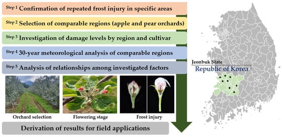 The apple cultivation area in Jeonbuk State in Republic of Korea spans approximately 2003 ha, with 74.6% (1495 ha) concentrated in mountainous regions (Jangsu and Muju) above 300 m in altitude. In contrast, pears are predominantly cultivated in coastal and plain regions such as Jeonju, Gimje, Wanju, and Gochang, accounting for about 65.8% (335 ha) [13]. However, frost injury during the flowering period has been reported as particularly severe in mid-mountainous regions, such as the Imsil and Namwon areas. Moreover, recent climate changes have raised concerns regarding low-temperature injury to fruit trees during various growth stages (dormancy, germination, and blooming). While research related to cold resistance, such as studies on winter minimum extreme temperatures and temperature variations [14], has been conducted, studies on frost injury during the flowering period in relation to specific cultivation regions remain limited.