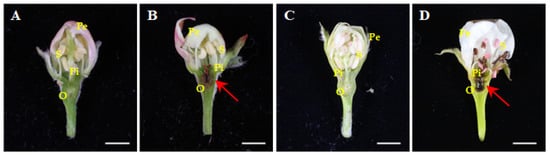Comparison of cross-sections of normal (A,C) and damaged (B,D) flowers in apple (A,B) and pear (C,D) at the flowering stage. The white solid scale bars indicate 0.5 cm. The red arrows indicate the injured pistil tissues, including the ovule, of apple and pear flowers. Pe: petal; Pi: pistil; S: stamens; O: ovary.