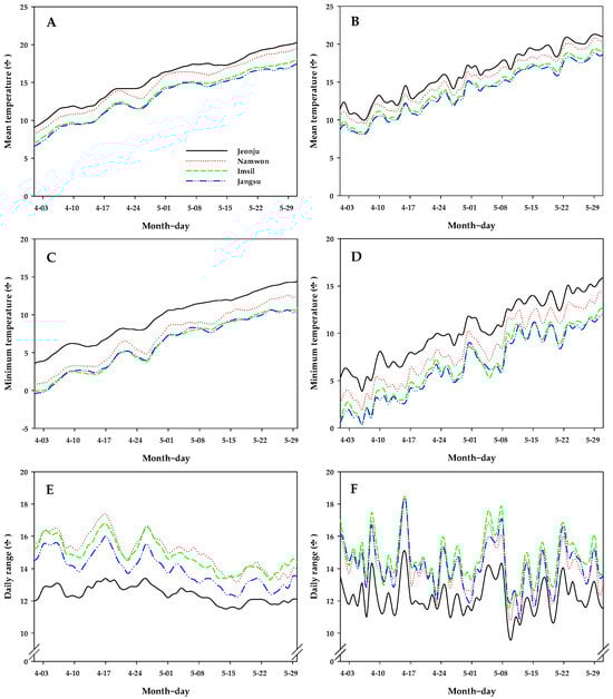 Comparison of minimum temperature and daily range at various regions based on AWS (Jeonju: an altitude of 60 m; Imsil: an altitude of 247 m; Namwon: an altitude of 133 m; Jangsu: an altitude of 407 m) of the past 30 years (1981–2010) and the past 12 years (2011–2022).