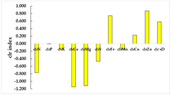 The median clr values of ‘Kinnow’ TP specimens (low-yielding and nutritionally imbalanced) were diagnosed using the ‘Kinnow’ clr and wlr means and standard deviations (Figure 2). The N, Ca, Mg, and S were in the highest relative shortage while Fe, Zn, and the filling value were in relative excess. Both diagnoses were similar.