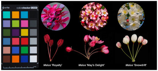 Flowers of three cultivars of crabapple in this study. A Colorchecker of X-rite was used for color correction of images.