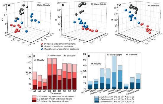 Color parameter distribution in CIELab color space and color difference of crabapple flower teas with different treatments. (a) Malus ‘Royalty’; (b) M. ‘May’s Delight’; (c) M. ‘Snowdrift’. (d) The color difference (ΔE) among dry flowers, infusion, and infused flowers in each treatment. (e) The color difference (ΔE) among different treatments for dry, infusion, and infused flowers. L*: the degree of lightness, a*: the degree of redness (+) or greenness (−), b*: the degree of yellowness (+) or blueness (−). Each treatment comprised a total of nine replicates. The values from each set of three replicates were averaged and are represented as a single data point (sphere in the CIELab color space). Consequently, each treatment yields three spheres in the CIELab color space.
