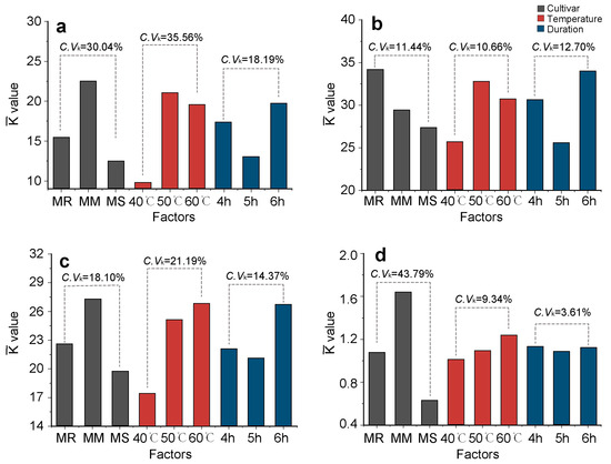 Kji value is defined as the sum of the evaluation indexes of all levels (i, i = 1, 2, 3) in each factor (j, j = cultivars, temperatures, durations), and (mean value of Kji) is used to determine the optimal level and combination of factors [21]. The optimal level for each factor can be obtained when is the largest. The formula for the variable coefficient of is as follows: