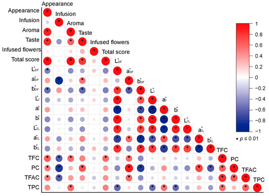 Correlation analysis between sensory evaluation, color parameters, and functional constituent contents. L*DF, a*DF, and b*DF are the color parameters of the dry flowers; L*I, a*I, and b*I are the color parameters of the infusions; and L*IL, a*IL, and b*IL are the color parameters of the infused flowers. TFC: total flavonoid content; PC: phlorizin content; TFAC: total free amino acid content; TPC: total polyphenol content.