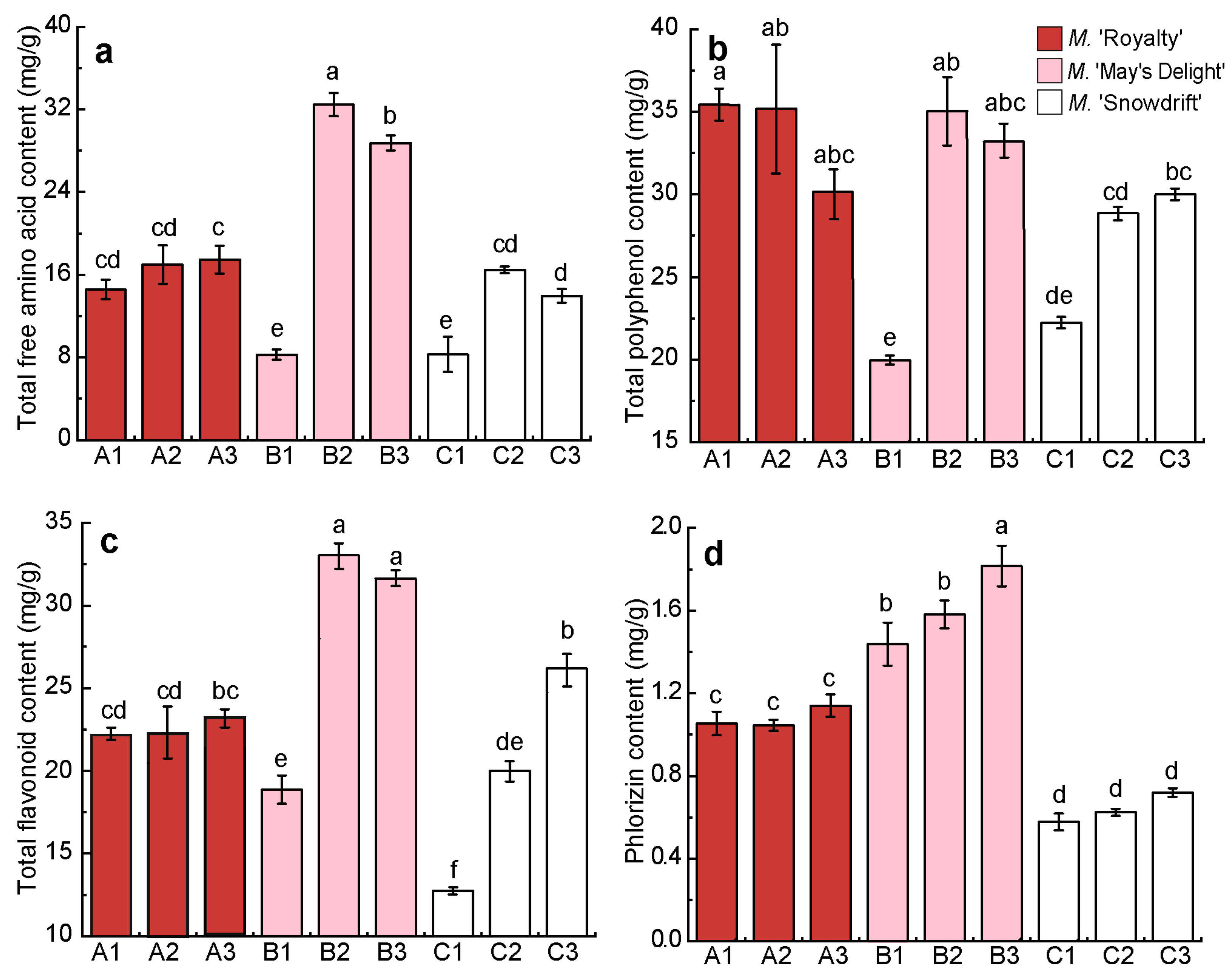 Contents of the main functional constituents in the dry flower tea of different crabapple cultivars. (a) The content of total amino acid; (b) The content of total polyphenol; (c) The content of total flavonoid; (d) The content of phlorizin. Values are the means (±S.D.) of three replicates. The same letters above the columns mean there is no significant difference among the different treatments (p > 0.05), and different letters indicate a significant difference (p < 0.05), using Turkey’s multiple range test.