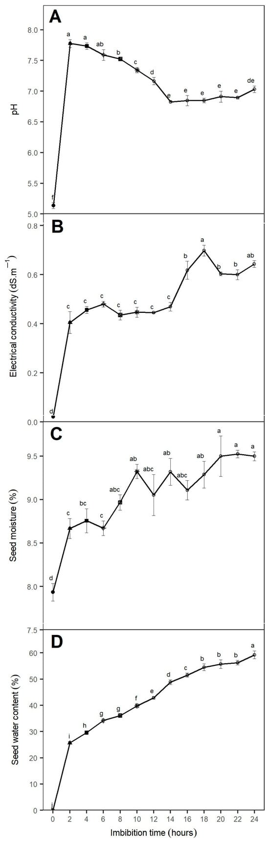 pH (A), electrical conductivity (EC); (B), seed moisture (C), and seed water content (D) after seed imbibition. The pH and EC were measured in the imbibition water, while seed moisture and seed water content were measured in seeds at each imbibition time. The letters indicate the mean difference, determined using the Student-Newman-Keuls test (p = 0.05). Means are presented with (±SE). n = 4.
