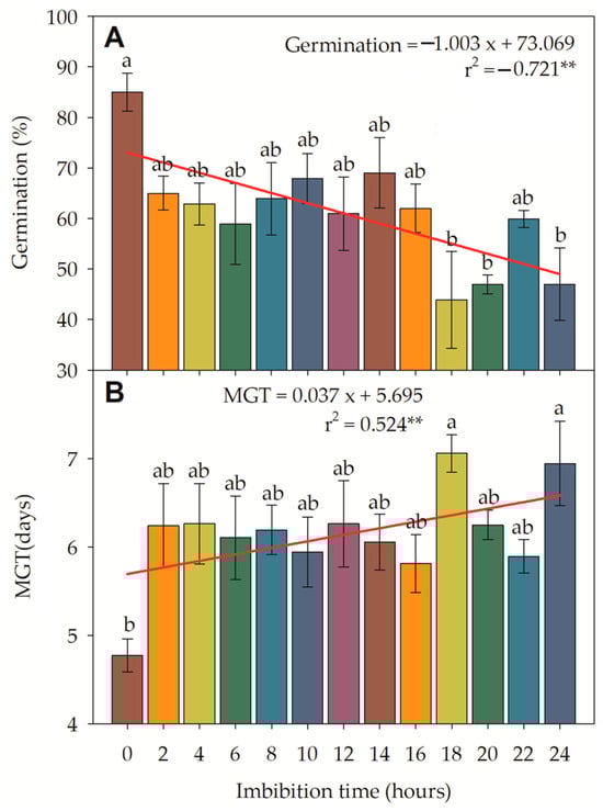 Germination response in Jatropha curcas seeds after different imbibition times. (A) Germination (%) and (B) Mean germination time (days). Means followed by different small case letters represent the difference with the Student-Newman-Keuls test (α = 0.05). Means are defined using (±SE) of 4 repetitions. ** denote significance at p ≤ 0.01.