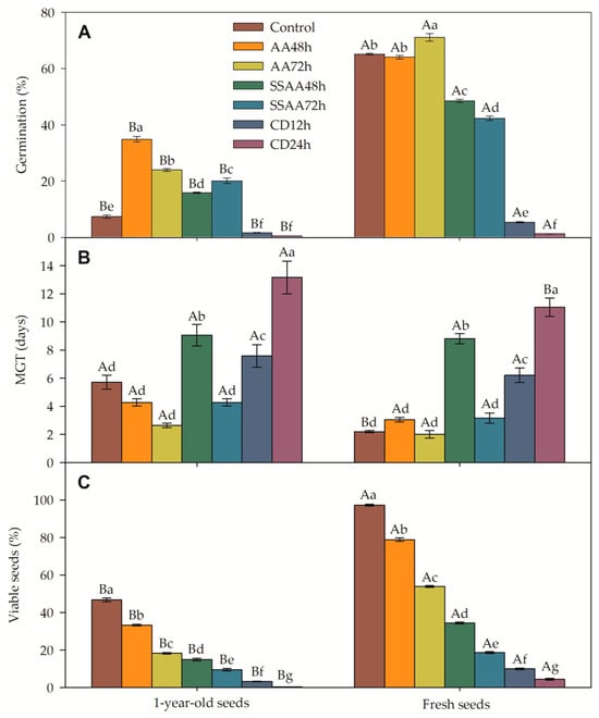 Under AA, the MGT increased substantially, especially for seeds subjected to 72 h of treatment. The more prolonged exposure to high temperature and humidity delayed germination, with the MGT of 1-year-old seeds extending considerably compared to fresh seeds. However, 24- or 72 h showed a similar increase in MGT, regardless of time in AA (Figure 3B). SSAA produced similar results, although the delay in MGT was slightly more pronounced than in the AA treatment, particularly for 72 h SSAA, which showed a germination delay 26.2% compared to 2.8% delay in 48 h SSAA. Then, the controlled environment of SSAA, which stresses the seeds while limiting water absorption, led to a more asynchronous germination process, as seen in the 1-year-old seeds, where MGT increased sharply.