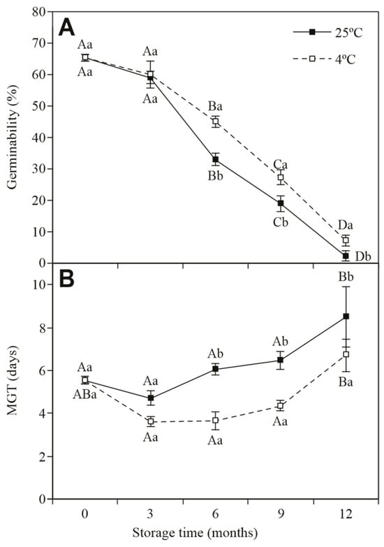 Seed germination (A) and mean germination time (B) of Jatropha curcas seeds after storage durations of 0, 3, 6, 9, or 12 months at either 25 °C (closed symbols) or 4 °C (open symbols). Means marked by different lowercase letters indicate statistically significant differences within the same storage period. In contrast, uppercase letters indicate statistically significant differences between the two storage temperatures (p ≤ 0.05, Newman–Keuls test). The data shown represent the average values (±SE) from four replicates, each containing 50 seeds.