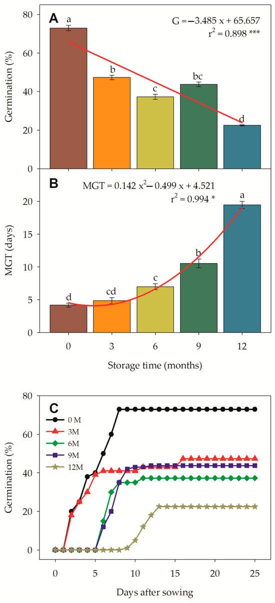 After each storage period, the seeds were selected, and seeds less than 15 mm [8] in length were discarded. Tiny seeds have poor germination, as previously reported by our team [37]. Also discarded were non-homogeneous seeds. After that, the seeds were germinated as described in Section 2.3. Germination was computed daily for 25 days. Using the germination percentage, the seed germination and MGT were computed. The germination in time was also determined, which shows how each treatment progressed within the time frame. All calculations followed the criteria described and recommended by Lozano-Isla et al. [35] and the formulas above.