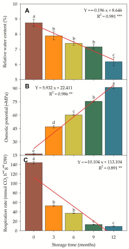 Relative water content (A), osmotic potential (B), and respiration rate (C) in Jatropha curcas seeds after storage in air-humidity-controlled containers by 0, 3, 6, 9, or 12 months at 4 °C. Means followed by different lowercase letters indicate statistically significant differences within the same storage period (p ≤ 0.05, Newman–Keuls test). The data shown represent the average values (±SE) from four replicates, each containing 50 seeds for (A), 15 seeds for (C), and 5 seeds for (B). ** denote significance at p ≤ 0.01 and *** denote significance at p ≤ 0.001.