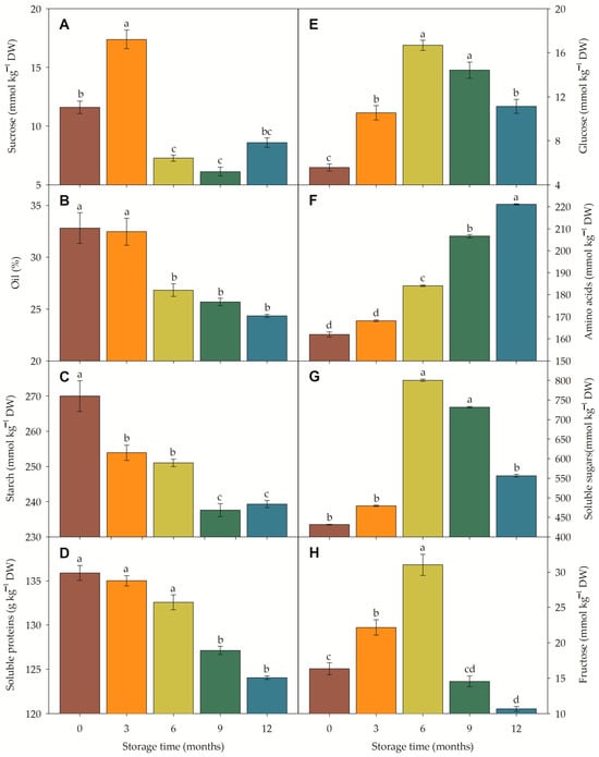 Sucrose (A), oil (B), starch (C), protein (D), glucose (E), amino acids (F), soluble sugars (G), and fructose (H) measured in Jatropha curcas seeds after storage in air-humidity-controlled containers by 0, 3, 6, 9, or 12 months at 4 °C. Means followed by different lowercase letters indicate statistically significant differences within the same storage period (p ≤ 0.05, Newman–Keuls test). The data shown represent the average values (±SE) from four replicates, each containing 50 seeds.