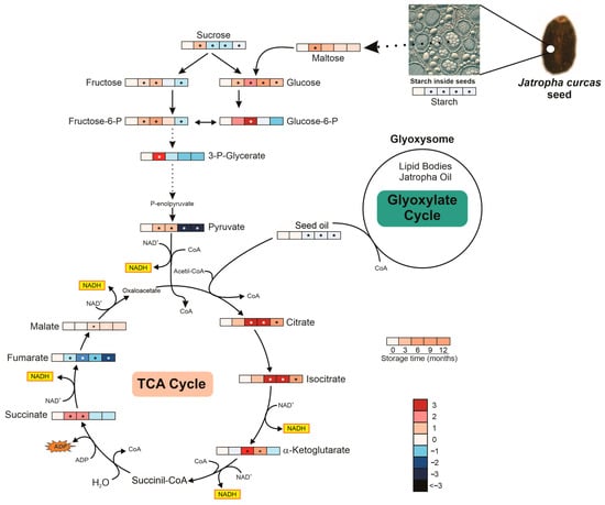 Figure 8 demonstrates that TCA cycle reactions were more active than glycolysis, possibly due to the activation of the glyoxylate cycle with beta-oxidations of lipid bodies, as shown by the reduction of 26% of the oil content in the seeds (Figure 7B and Figure 8). The catalysis of proteins into amino acids, producing glutamate and α-ketoglutarate, is another possibility of higher activation of the TCA cycle than glycolysis.