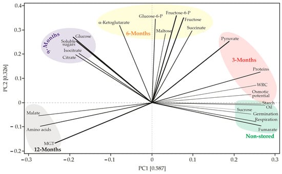 All data for germination, MGT, water content, biochemical, and metabolic analysis were grouped in a multivariate analysis through principal component analysis (PCA). The PCA, composed of PC1 (0.587) and PC2 (0.326), represents at least 91.3% of the possible variation in these datasets that this PCA could represent. All components were distributed in five groups in a cartesian plan following Euclidian distance at 71.2% dissimilarity. Group 1, formed by non-stored seeds, comprehends the features of respiration, germination, starch, oil, sucrose, and fumarate (Figure 9). In group 2, formed by seeds stored for 3 months, the features of osmotic potential, WRC, proteins, and pyruvate were grouped according PCA, while in a group formed by seeds stored for 6 months, the features of fructose, fructose-6-P, glucose-6-P, α-ketoglutarate, succinate and maltose were grouped. Group 4 englobes the features of soluble sugars, glucose, citrate, and isocitrate. Finally, group 5 was formed by malate, amino acids, and MGT. In summary, each group was formed by a specific functional activity predominant in each group of seeds, such as high germination and respiration activity that marked the non-stored seeds group. In contrast, the highest production of amino acids is stamped the group 5 (Figure 9).