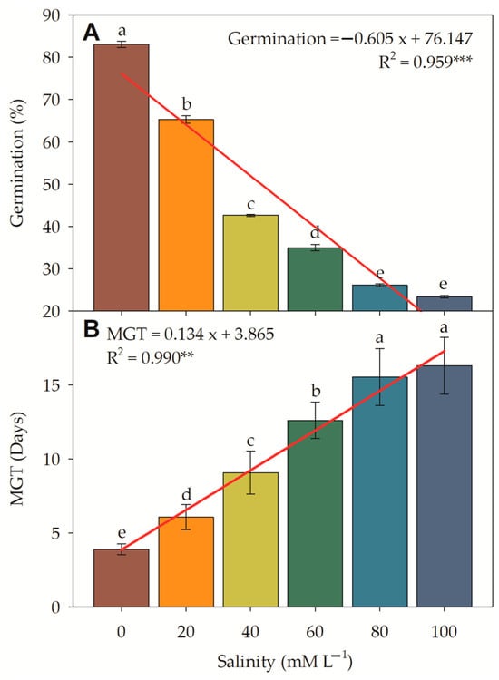 Effect of NaCl on seed germination (A) and mean germination time (MGT); (B) computed in Jatropha curcas seeds after storage in air-humidity-controlled containers by 3 months at 4 °C. Means followed by different lowercase letters indicate statistically significant differences within the same storage period (p ≤ 0.05, Newman–Keuls test). The data shown represent the average values (±SE) from four replicates containing 50 seeds. ** denotes a significance at p ≤ 0.01 and *** denotes significance at p ≤ 0.001.