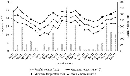 The study was undertaken in Taubaté, São Paulo state, in southeastern Brazil, located at 23°01′49.61″ S and 45°30′28.25″ W, with an altitude of 565 m.a.s.l. The region has a Cfa climate, or subtropical climate with hot summers, according to the Köppen–Geiger classification system. The study region is characterized by rainy summers and dry winters, with an average annual rainfall of 1.335 mm [28], concentrated between December and February, and an average temperature of 21 °C [29,30]. The climate data for the two harvesting seasons were collected from the National Institute of Meteorology—INMET (Figure 1). The soil of the study site is classified as a Latossolo Vermelho Amarelo according to the Brazilian System of Soil Classification [31].
