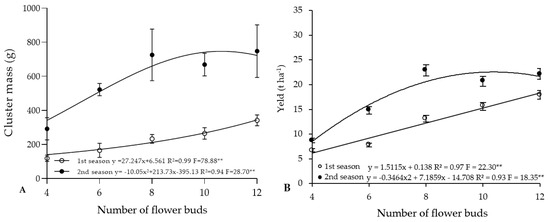 Cluster mass (g) (A) and yield (t ha−1) (B) of ‘Precoce de Itaquera’ (Fukuhara) loquat as a result of flower bud thinning intensities and harvest seasons. ** = significant at 1% by the F test.
