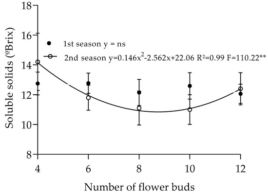 Soluble solids content of ‘Precoce de Itaquera’ (Fukuhara) loquat as a function of flower bud thinning intensities and two harvest seasons. ns = not significant; ** = significant at 1% by the F test.